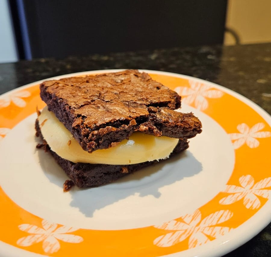 Dois pedaços de brownie chocolatudo, rechado com brigadeiro de ninho cremoso e creme de ovomaltine.