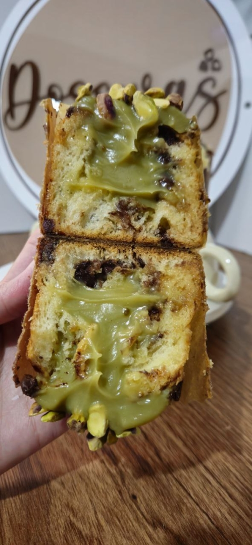 Panetone de baunilha com gotas de chocolate e recheio de pistache cremoso. Um sabor autêntico que veio pra ficar, se ainda não experimentou, não perca a oportunidade.