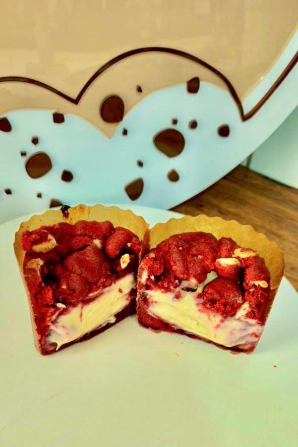 Cookietone com massa red de baunilha e cacau, com gotas de chocolate branco e recheio cremoso de cream cheese. aprox. 200g
