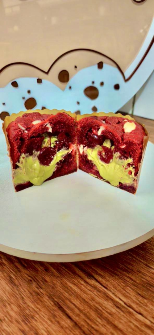 Cookietone com massa red de baunilha e cacau, com gotas de chocolate branco e recheio cremoso de pistache e cerejas. aprox. 200g