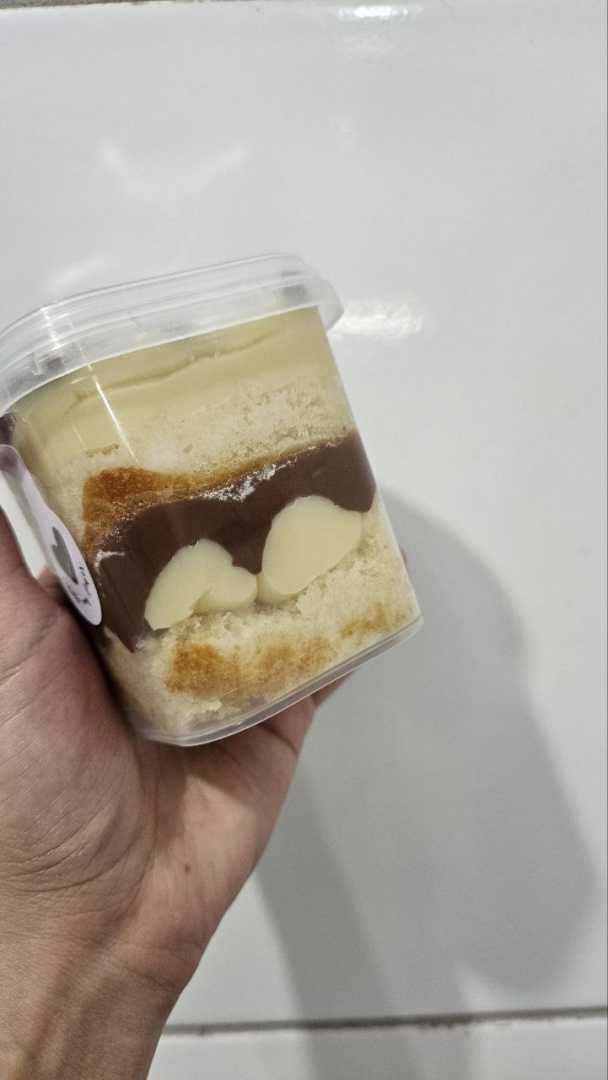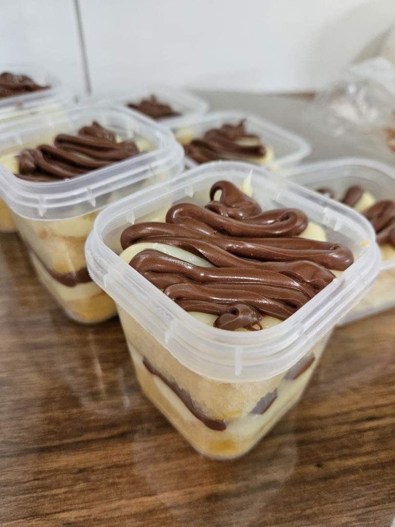 Duas camadas de massa de baunilha, regado com uma calda neutra de açúcar e duas camadas generosas de recheio de leite Ninho e Nutella pura.